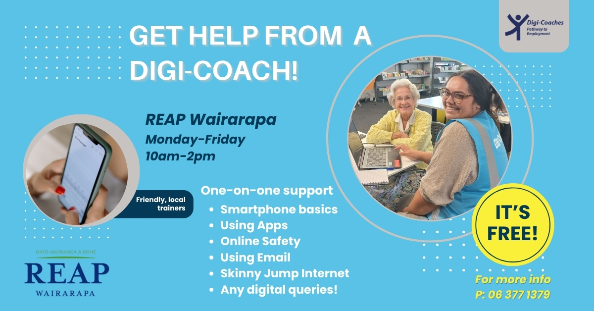 Are a you a bit unsure with your digital device? Starting 22nd September 2025 drop in to REAP Wairarapa from 10am – 2pm and talk to our Digi-Coach!